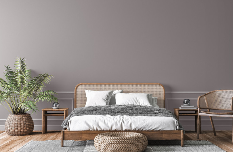 Szara sypialnia ze ścianą za łóżkiem pomalowaną farbą MAGNAT #kolorLove w odcieniu KL17 jasnoszary.