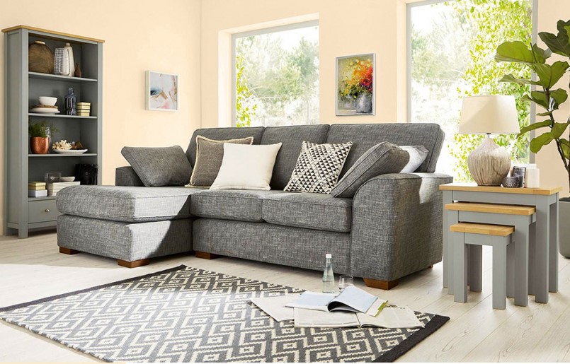 Mały salon w bloku często pełni nie tylko funkcję reprezentacyjną i rekreacyjną, ale jednocześnie jest również sypialnią rodziców. W takiej przestrzeni zdecydowanie potrzebujesz wysokiej jakości, trwałej sofy narożnej z funkcją spania codziennego z pojemną skrzynią na przechowywanie pościeli. Tu również wymagana jest jasna paleta kolorystyczna, nie tylko by powiększać przestrzeń, ale również pozytywnie wpływać na sen. Pastelowe ciepłe barwy z pewnością ukoją twoje zmysły, gdy ułożysz się do spania. Taką moc ma między innymi odcień C24 Gwiezdny Kwarc z palety ceramicznych, niezwykle trwałych farb MAGNAT Ceramic.