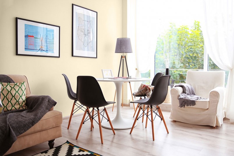 Operowanie jasną paletą kolorystyczną w salonie z sypialnią o małej powierzchni nie musi być nudne. Wystarczy dodać parę kontrastujących barwnych akcentów, by ożywić przestrzeń. Czarne ramy obrazów lub czarne elementy mebli świetnie wybiją się na tle jasnych ścian pomalowanych farbą MAGNAT Ceramic Care A41 Kremowy Marmur. Dobrym sposobem jest również zabawa formą - oprócz klasycznych brył mebli wprowadź do mieszkania fantazyjne konstrukcje.