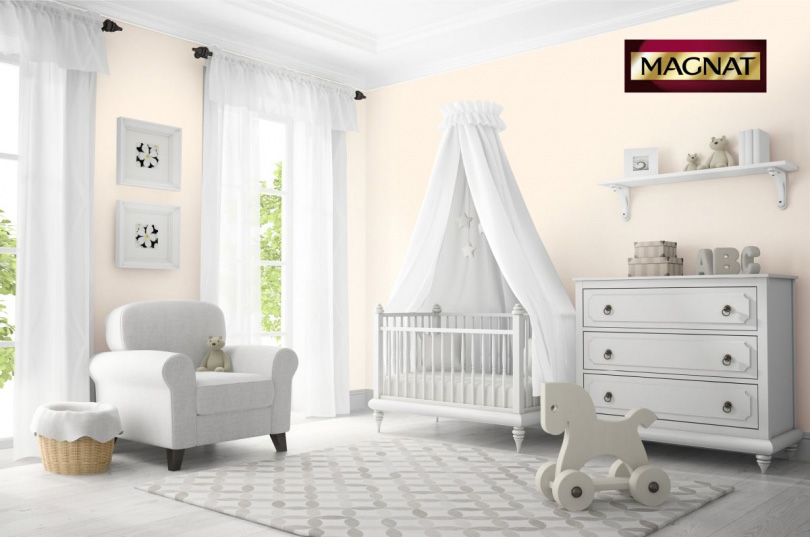 Farby MAGNAT Ceramic bazują na ceramicznych komponentach oraz najwyższej jakości żywicach i pigmentach, co zapewnia im ponadprzeciętne parametry odporności na szorowanie i wielokrotne zmywanie. Powłoki tych farb nie absorbują zabrudzeń i „trudnych” plam oraz są odporne na środki dezynfekujące, co czyni z nich idealny wybór do pokoju dziecięcego. W prezentowanej aranżacji zastosowaliśmy farbę MAGNAT Ceramic C43 zwycieski aleksandryt.
