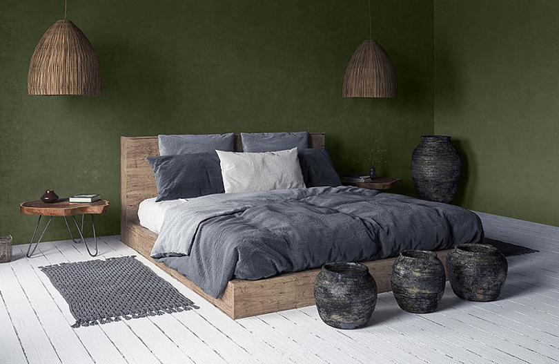 Ciemna zieleń w sypialni to bezsprzecznie designerski hit, ale też przemyślany wybór, bo w połączeniu z kolorami ziemi, owocuje niezwykle przytulną atmosferą. Plecionki, drewno, sznury, rattan, to materiały, dzięki którym nadasz pomieszczeniu ciepła i nie zatracisz jego wytworności. Nawet w małej sypialni możesz pomalować ściany na bardzo ciemny kolor, taki jak CR45 Sławny Perydot od MAGNAT Creative. Wybierz wówczas meble w kolorze ściany, co sprawi, że unikniesz złudzenia ciężkości, o które nietrudno w małych pokojach. Jeśli twoja sypialna jest duża, nie bój się odważnych dodatków, nawet kamiennych, czy betonowych. Zdecyduj się na mocną zieleń w sypialni, a przekonasz się, że to najlepszy kompan dobrego snu, twórca niezwykłego klimatu i naturalny odcień nocy.