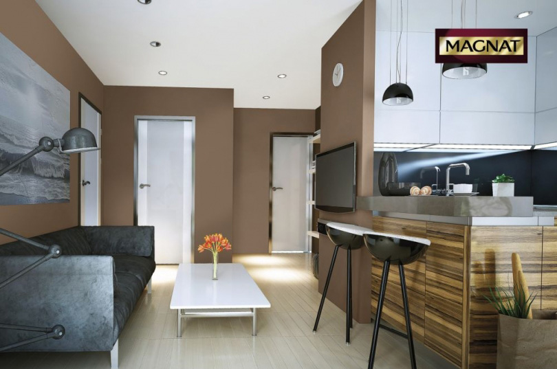 Kiedy wchodzimy do pokoju pierwsze, na co zwracamy uwagę to wygląd ścian. Kolor farby współgrający z meblami i dodatkami jest podstawą w aranżacji pomieszczenia. Przykłada się również uwagę do tego czy farba optycznie powiększa pomieszczenie, czy je pomniejsza. Farba ceramiczna MAGNAT CERAMIC - CERAMICZNA FARBA DO WNĘTRZ wydobywa głębię koloru, zwłaszcza wtedy, kiedy jest on ciemny. Powiększy zatem niewielkie pomieszczenie, dodając mu przestronności. Na dużych powierzchniach także prezentuje się bardzo dobrze. Ważne tylko jest, aby przed malowaniem odpowiednio przygotować podłoże. Ściana musi być gładka – w ten sposób kolor będzie się na niej pięknie prezentował. Alternatywą dla farby ceramicznej jest farba głęboko matowa. Produkt idealnie ukrywa wszelkie niedoskonałości powierzchni, dlatego możemy pomalować nią nawet stare ściany z ubytkami. Tego typu farba pięknie wygląda w dużych, przestronnych pomieszczeniach. Nie odbija ona jednak światła, dlatego może niekorzystnie wyglądać w małych wnętrzach, optycznie je pomniejszając.