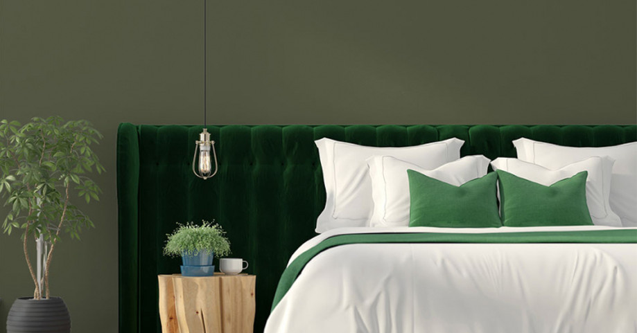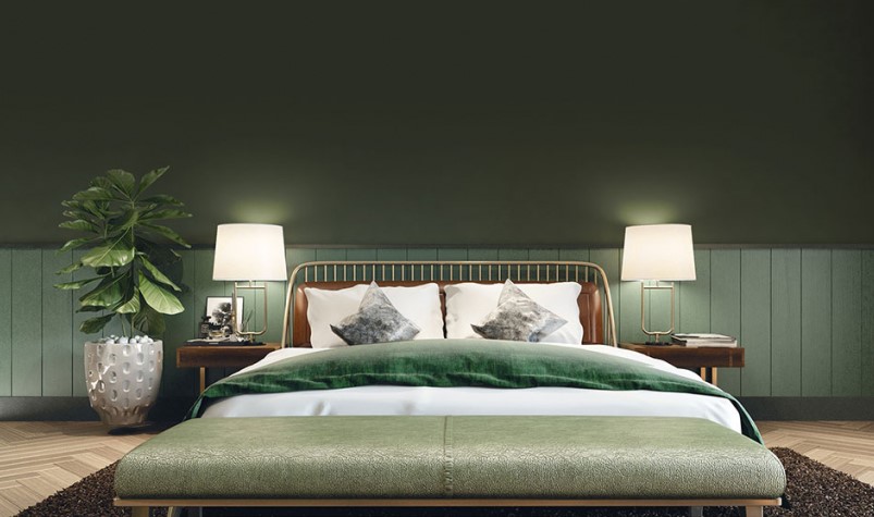 Szałwiowe ściany są obecnie bardzo modnym rozwiązaniem. Dobrze komponują się z bielą, szarościami oraz innymi pochodnymi zieleni. Kolor szałwiowy ładnie odcina się od różnych tonów żółtego i złota. Przyjemnie również kontrastuje z pudrowym różem, dlatego w swojej szałwiowej sypialni rozważ bladoróżowe dodatki. Zobacz również, jak oryginalnie i nowocześnie wygląda jedna ze ścian pokryta tapetą we wzór w odcieniu szałwii tuż przy ścianie w całości pokrytej hybrydową farbą MAGNAT Creative CR44 Fenomenalny Aleksandryt. Warto zwrócić uwagę na te produkt. Oprócz wyjątkowej barwy, łączy ze sobą dwie właściwości: odporność na płynne zabrudzenia oraz odporność na tłuszcze. Głęboko matowe wykończenie podkreśla natomiast głębię koloru. Dodatkowo, farba MAGNAT Creative jest odporna na zmywanie i szorowanie, a samo usuwanie plam i zabrudzeń z jej powierzchni jest bardzo łatwe.
