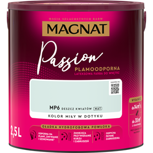 MAGNAT Passion to farba lateksowa o plamoodpornych i hydrofobowych właściwościach. Gładka i matowa powłoka farby podkreśla głębię koloru i sprawia, że pomalowane ściany są wyjątkowo miłe w dotyku.