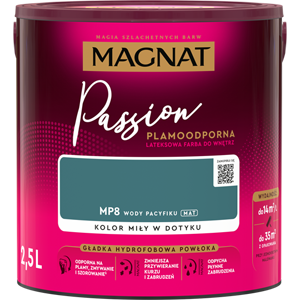 MAGNAT Passion to farba lateksowa o plamoodpornych i hydrofobowych właściwościach. Gładka i matowa powłoka farby podkreśla głębię koloru i sprawia, że pomalowane ściany są wyjątkowo miłe w dotyku.