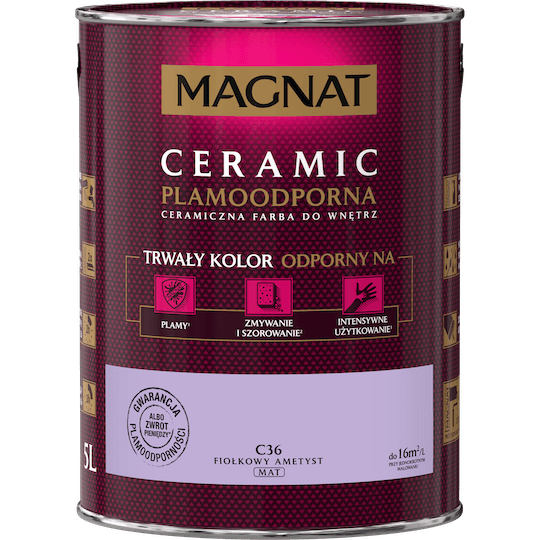 MAGNAT Ceramic to ceramiczna farba do wnętrz bazująca na ceramicznych komponentach oraz najwyższej jakości żywicach i pigmentach. Ta unikalna formuła zapewnia farbie MAGNAT trwały kolor odporny na: plamy, zmywanie i szorowanie oraz intensywne użytkowanie .