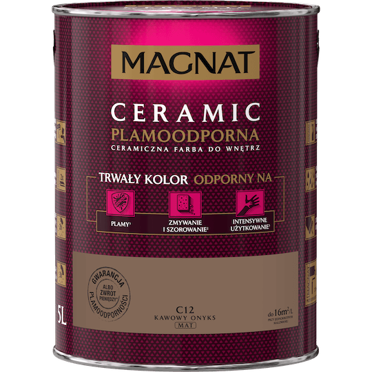 MAGNAT Ceramic to ceramiczna farba do wnętrz bazująca na ceramicznych komponentach oraz najwyższej jakości żywicach i pigmentach. Ta unikalna formuła zapewnia farbie MAGNAT trwały kolor odporny na: plamy, zmywanie i szorowanie oraz intensywne użytkowanie .