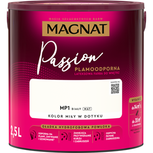 MAGNAT Passion to farba lateksowa o plamoodpornych i hydrofobowych właściwościach. Gładka i matowa powłoka farby podkreśla głębię koloru i sprawia, że pomalowane ściany są wyjątkowo miłe w dotyku.