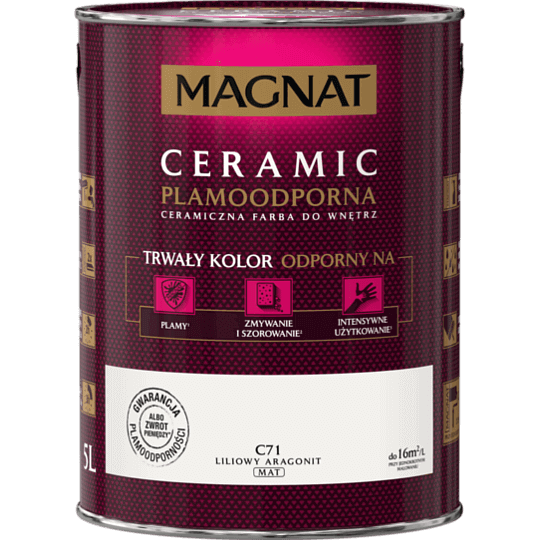 MAGNAT Ceramic to ceramiczna farba do wnętrz bazująca na ceramicznych komponentach oraz najwyższej jakości żywicach i pigmentach. Ta unikalna formuła zapewnia farbie MAGNAT trwały kolor odporny na: plamy, zmywanie i szorowanie oraz intensywne użytkowanie .
