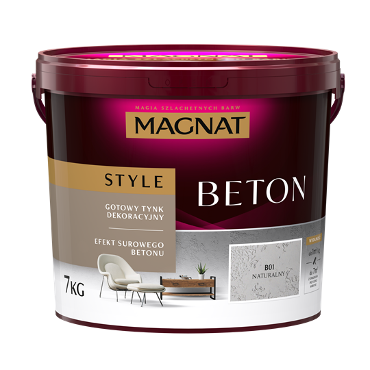 MAGNAT Style Beton to gotowy do użycia tynk dekoracyjny stosowany do nakładania oraz modelowania powierzchni pozwalający uzyskać efekt surowego betonu. Tynk przeznaczony jest do ręcznego i natryskowego nakładania wewnątrz pomieszczeń mieszkalnych, biurowych i użyteczności publicznej. Może być stosowany na różnych podłożach. m. in. tynki cementowo-wapienne, beton, płyty gipsowo-kartonowe oraz wszelkie podłoża po ich wcześniejszym przygotowaniu.