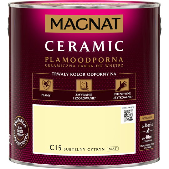 MAGNAT Ceramic to ceramiczna farba do wnętrz bazująca na ceramicznych komponentach oraz najwyższej jakości żywicach i pigmentach. Ta unikalna formuła zapewnia farbie MAGNAT trwały kolor odporny na: plamy, zmywanie i szorowanie oraz intensywne użytkowanie .