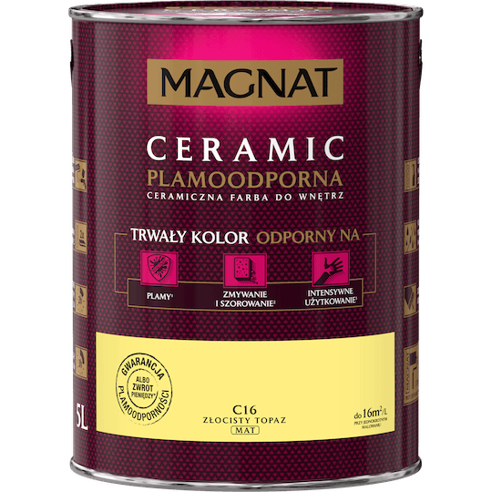 MAGNAT Ceramic to ceramiczna farba do wnętrz bazująca na ceramicznych komponentach oraz najwyższej jakości żywicach i pigmentach. Ta unikalna formuła zapewnia farbie MAGNAT trwały kolor odporny na: plamy, zmywanie i szorowanie oraz intensywne użytkowanie .