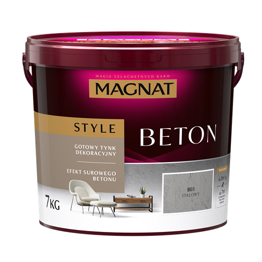 MAGNAT Style Beton to gotowy do użycia tynk dekoracyjny stosowany do nakładania oraz modelowania powierzchni pozwalający uzyskać efekt surowego betonu. Tynk przeznaczony jest do ręcznego i natryskowego nakładania wewnątrz pomieszczeń mieszkalnych, biurowych i użyteczności publicznej. Może być stosowany na różnych podłożach. m. in. tynki cementowo-wapienne, beton, płyty gipsowo-kartonowe oraz wszelkie podłoża po ich wcześniejszym przygotowaniu.