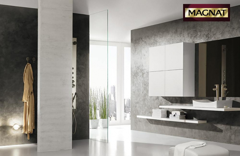 Beton dekoracyjny do łazienki to niekoniecznie ciężkie płyty betonu architektonicznego. Nie każda ściana jest gotowa na uniesienie takiej masy. A nawet jeśli da radę, sam montaż płyt może być uciążliwy, szczególnie w niedużych łazienkowych pomieszczeniach. Dużo sensowniejszym rozwiązaniem staje się wtedy tynk dekoracyjny zefektem betonu. Taki jak Beton MAGNAT Style.Jego odpowiednia aplikacja na ścianie pozwala uzyskać doskonały efekt naturalnego, surowego betonu, z charakterystycznymi dla tego materiału przebarwieniami. Używając rożnych narzędzi i technik można również uzyskać w łatwy sposób różne atrakcyjne wizualnie efekty: deskowania, stalowej formy, gładki czy lity z charakterystycznymi wżerami i ubytkami. Beton MAGNAT Style zabezpiecza się bezbarwnym Lakierem Rustykalnym MAGNAT Style, dzięki temu jest ona odporna na szorowanie i zmywanie wodą z dodatkiem detergentów.