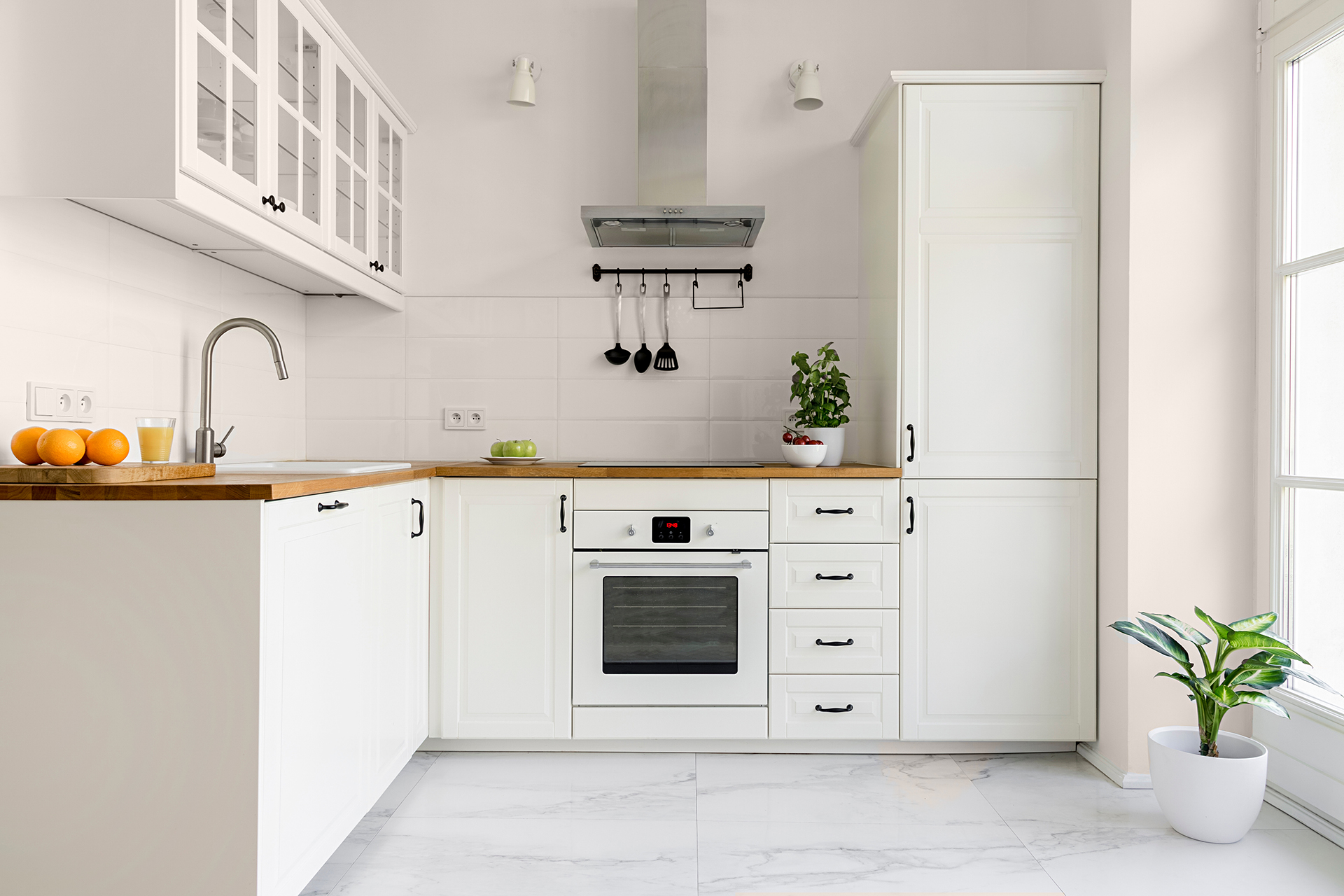 W aranżacji na zdjęciu jasny kolor zabudowy połączono z klasycznymi płytkami-cegiełkami oraz z kolorem ściany écru. Propozycja farby to B4 Jasnobeżowy Opal MAGNAT Ceramic Kuchnia, Łazienka.
