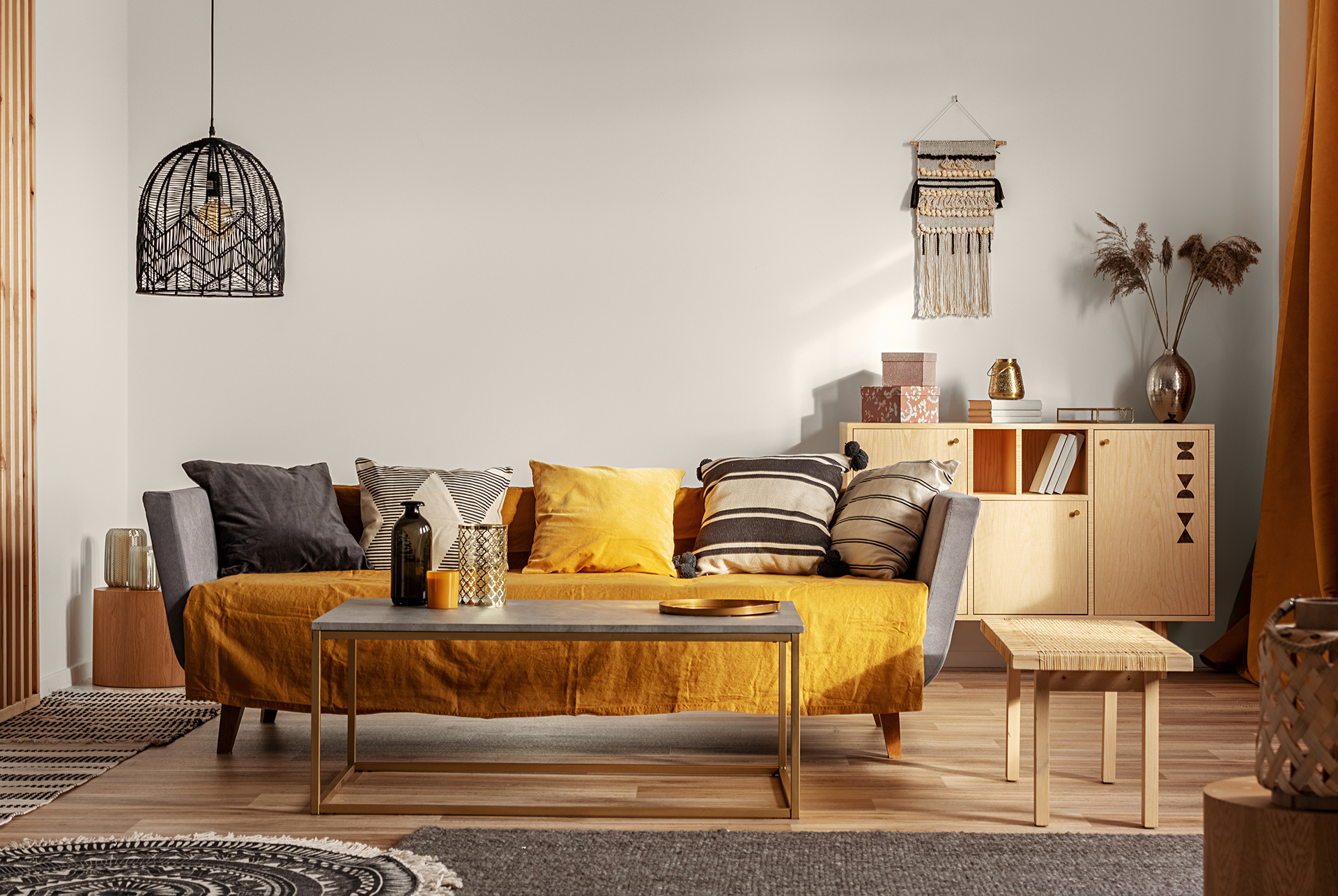 Drewniane meble w naturalnym odcieniu doskonale podkreślą ciepło koloru écru i wprowadzą do wnętrza przytulną atmosferę. Jeśli wolisz inny kolor niż drewno, postaw na matową czerń, biel lub szarość.