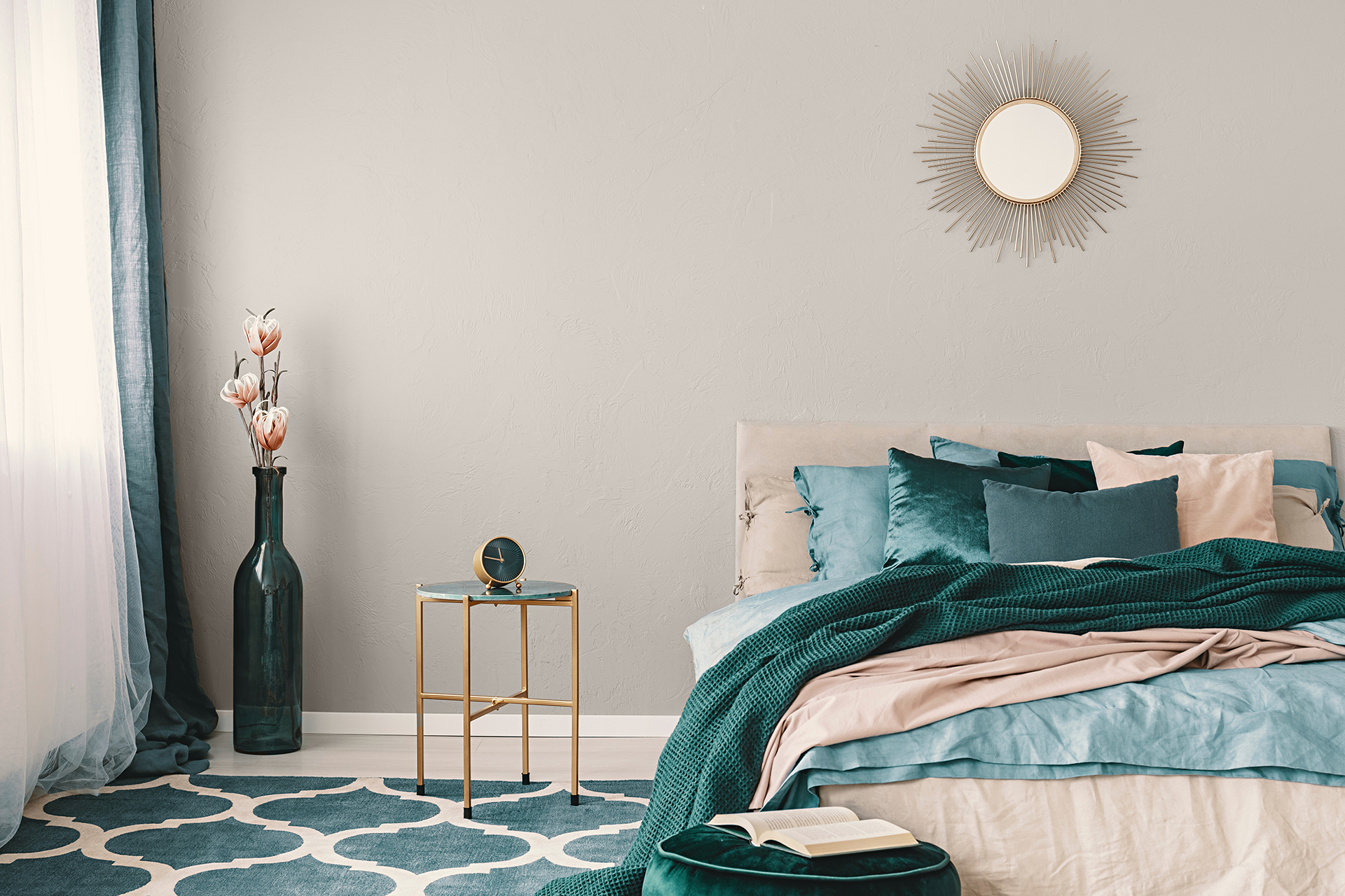 Kolor écru dobrze łączy się nie tylko z innymi barwami ziemi, ale także z kolorami zaczerpniętymi z natury, w tym ze szlachetnymi zieleniami. Prezentowana aranżacja sypialni jest tego najlepszym dowodem. Kolor écru na ścianie zestawiono ze szmaragdową zielenią. Dodatkową ozdobą są błyszczące faktury tkanin oraz złote detale.