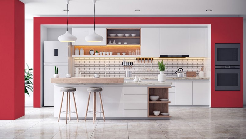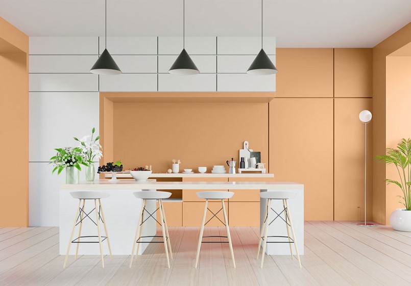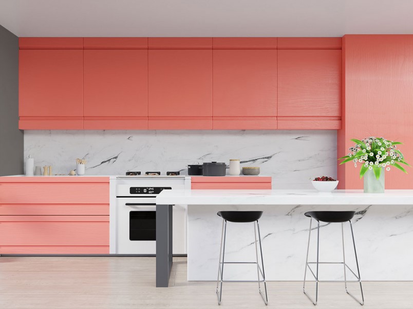 Kolor koralowy na ścianie z pewnością przełamie monotonię monochromatycznej aranżacji kuchennej. Stworzy w jej wnętrzu przyjazną, ciepłą atmosferę i zdecydowanie ożywi całą przestrzeń.