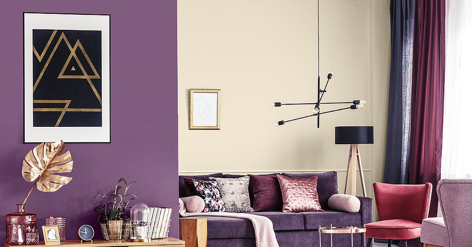 Chcąc uniknąć tego typu nieprzyjemnego doświadczenia, dobrze jest zestawić fiolet z lekkością kremu, który przełamuje jego dominację w aranżacji. Rozjaśnia, rozświetla i zaciera wrażenie ciężkości i przytłoczenia intensywnością barwy. Przekona się o tym malując ściany w swoim salonie wybierając farby MAGNAT Ceramic w odcieniach C55 Magiczny Almandyn i C4 Perła Północy.