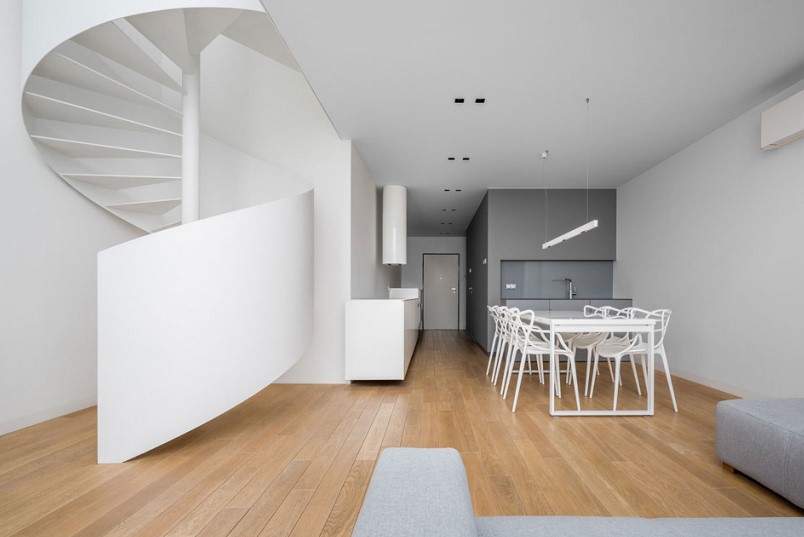 Marzy ci się wielofunkcyjny salon otwarty na kuchnię i jadalnię? Co powiesz na kręcone schody prowadzące na piętro? Rozwiązanie to nie tylko będzie praktyczne, ponieważ zaoszczędzi miejsce, ale również spełni rolę dekoracji wnętrza, dzięki swojej nieoczywistej, fantazyjnej formie. Kolory użyte w aranżacji to C30 Srebrzysty Granit i C31 Grafitowy Marmur od MAGNAT Ceramic.