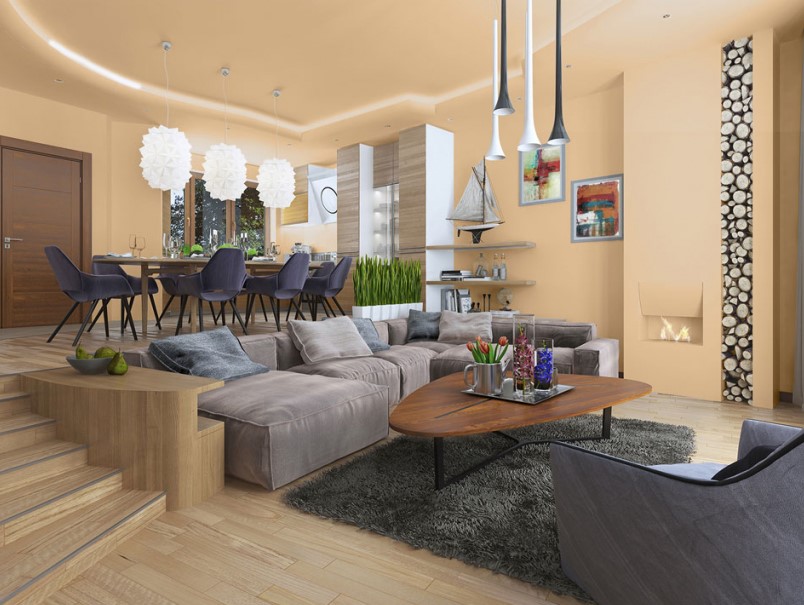 Otwarta przestrzeń, pomysł na aranżację małego salonu ze schodami