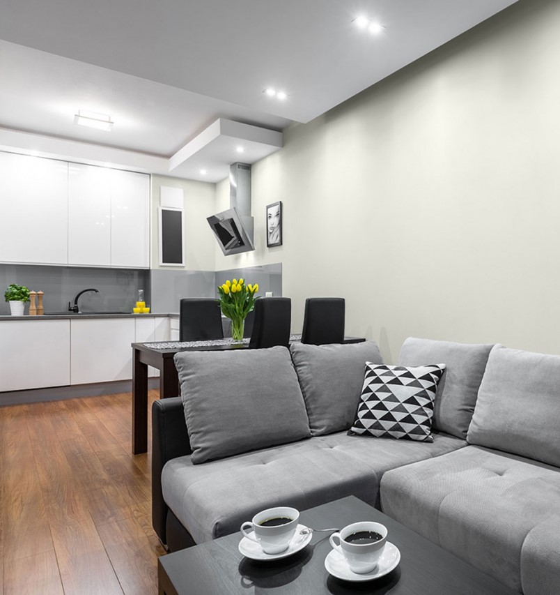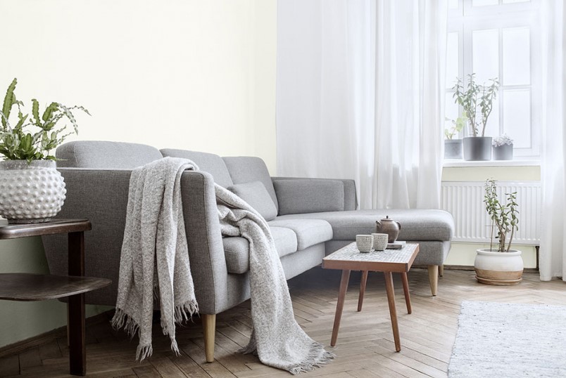 Mały salon w bloku często pełni nie tylko funkcję reprezentacyjną i rekreacyjną, ale jednocześnie jest również sypialnią rodziców. W takiej przestrzeni zdecydowanie potrzebujesz wysokiej jakości, trwałej sofy narożnej z funkcją spania codziennego z pojemną skrzynią na przechowywanie pościeli. Tu również wymagana jest jasna paleta kolorystyczna, nie tylko by powiększać przestrzeń, ale również pozytywnie wpływać na sen. Pastelowe ciepłe barwy z pewnością ukoją twoje zmysły, gdy ułożysz się do spania. Taką moc ma między innymi odcień C24 Gwiezdny Kwarc z palety ceramicznych, niezwykle trwałych farb MAGNAT Ceramic.