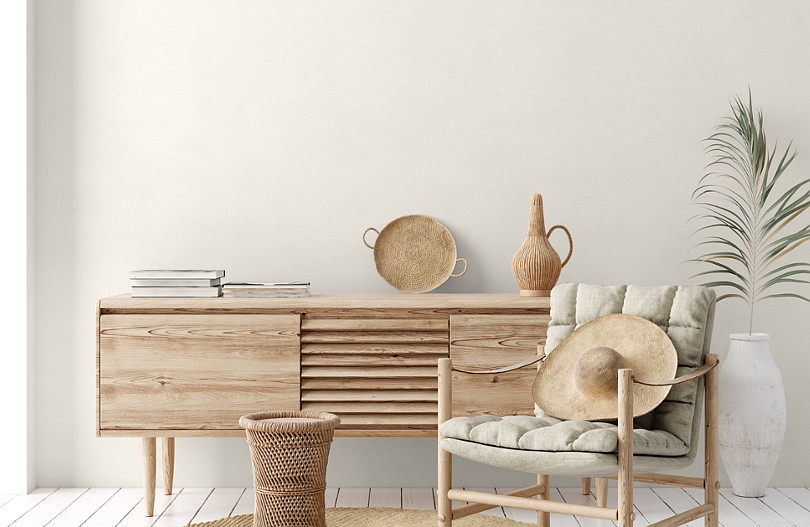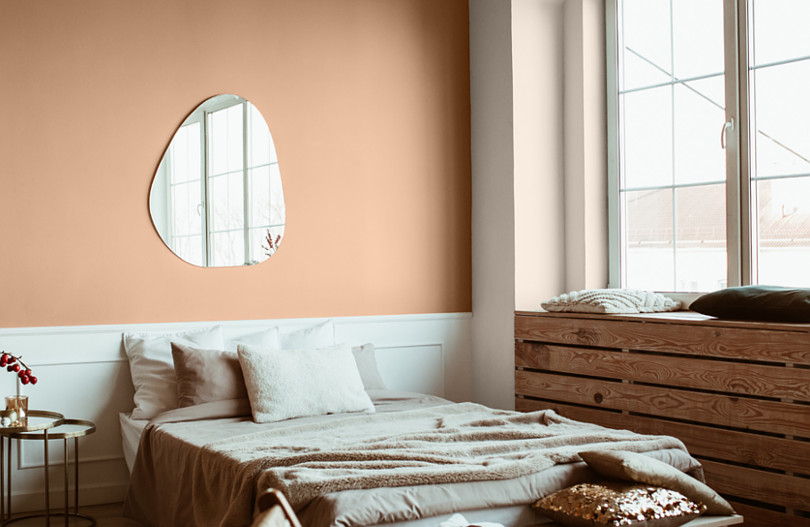 Zacznij od pomalowania ścian farbami MAGNAT Creative. Pokryj je odcieniem CR3 Unikalny Bronzyt, natomiast detale architektoniczne jak lamperie, gzymsy i wnęki okienne pomaluj na biało, używając farby CR8 Niewinna Biel. Wybierz wyposażenie wykonane z naturalnych surowców, które wniosą do wnętrza jeszcze jeden element dekoracyjny – zróżnicowane faktury i struktury. Spójrz, jak ciekawie w tej wizualnie ogrzanej przestrzeni wygląda podłoga, meble i osłona na grzejnik wykonane z drewna z widocznym rysunkiem słojów, włókien i sęków, a także szorstki jutowy chodnik, krzesło z plecionym oparciem, czy kapy i poduszki z wełny. Jak widzisz, faktury i struktury z powodzeniem zastępują wzory.