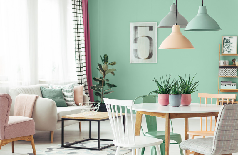Jeśli lubisz kolor zielony, do pomalowania ścian z palety farb MAGNAT Creative wybierz odcień CR44 Fenomenalny Alesandryt. Pastele dobrze łączą się z innymi pastelami, dlatego na tle tej stonowanej zieleni pięknie będzie wyglądać pudrowy róż, błękit czy jasna brzoskwinia. Idealnym dopełnieniem tego zestawienia będą: szarość, kremy, biele i jasne odcienie drewna. Taka miękka i spokojna przestrzeń aż się prosi o mocny kolorystyczny akcent. Zobacz, jak dużo wniosły do wnętrza fuksjowe zasłony, czarny stelaż stołu i czarna donica oraz żywa zieleń kwiatów doniczkowych.