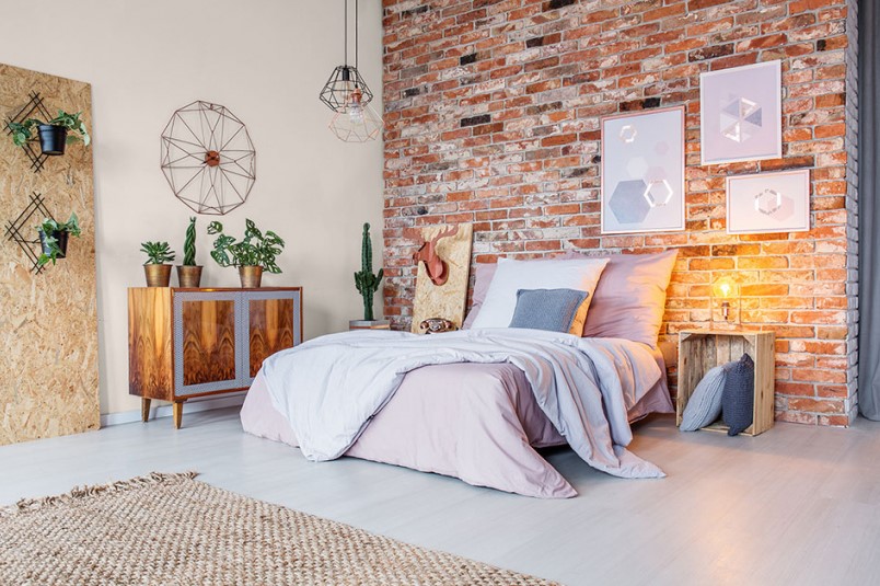 Jeśli lubisz chropowatą, nieregularną fakturę czerwonej cegły, zaaranżuj ścianę za łóżkiem przy jej pomocy. Ciepłe, rude bloczki wprowadzą niepowtarzalny klimat do wnętrza. Gdy ściany boczne pomalujesz na biało farbą MAGNAT Creative CR48 Apetyczny Opal, wtedy nic nie odciągnie wzroku od cegieł. Na takim tle pięknie będzie wyglądała jasna szaro-biała pościel oraz wyposażenie wnętrz z naturalnych surowców jak drewno, rattan czy wiklina.