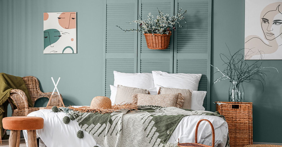 Kolory ścian do sypialni – inspiracje z farbą MAGNAT #kolorLove. Zielona ściana w sypialni w stylu boho. Użyta farba to MAGNAT #kolorLove KL23 delikatna mięta.