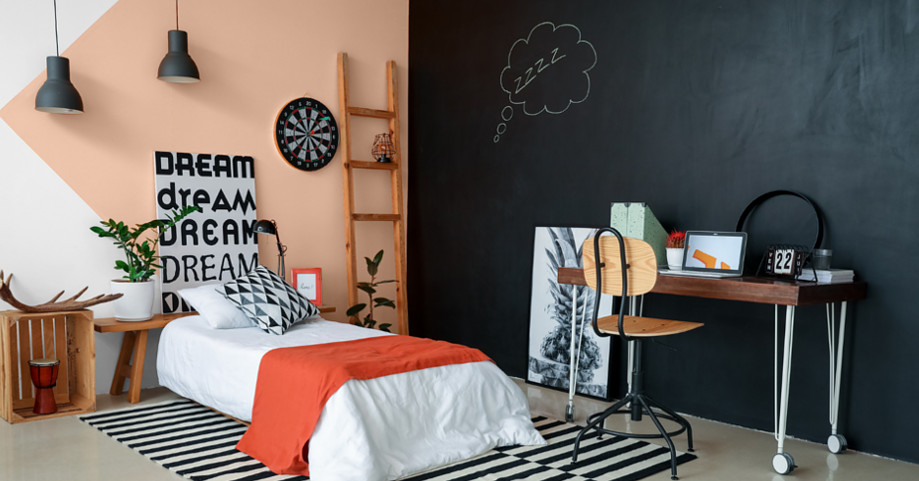 W młodzieżowej sypialni zamiast spokoju i ukojenia oczekuje się raczej efektu wow! i ciekawych, mocnych kolorów. W aranżacji na zdjęciu jedną ścianę pomalowano czarną farbą MAGNAT Farba Tablicowa. Ścianę za łóżkiem wykończono z kolei dwoma kolorami – białym C45 i naturalnym koralowym C26 koralowa laguna MAGNAT Ceramic.