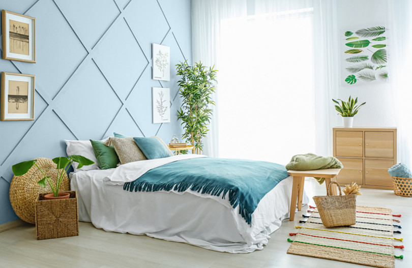 W aranżacji sypialni na zdjęciu listewki ułożono w modny wzór karo. Całość pomalowano następnie farbą MAGNAT Ceramic – to kolor C57 niebiański chalcedon. Ten piękny odcień błękitu z lekko turkusową nutą doskonale pasuje do bieli, jasnego drewna, plecionki i różnych odcieni zieleni.