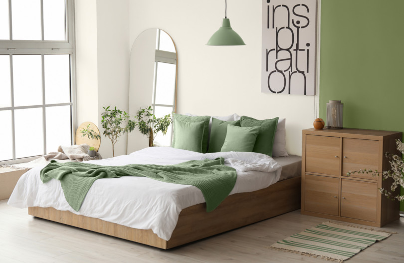 Sypialnia z jedną ścianą pomalowaną na kolor zielony. To odcień A45 egipski perydot MAGNAT Ceramic Care.