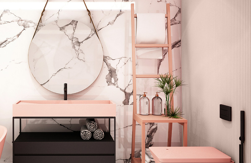 Jak dobrać kolor farby na ścianę do łazienki jak na zdjęciu poniżej? Z palety MAGNAT Ceramic Kitchen&Bathroom wybierz odcień B13 deszczowy morganit. To pudrowy, brudny róż, fantastycznie wyglądający w połączeniu z bielą i czernią.