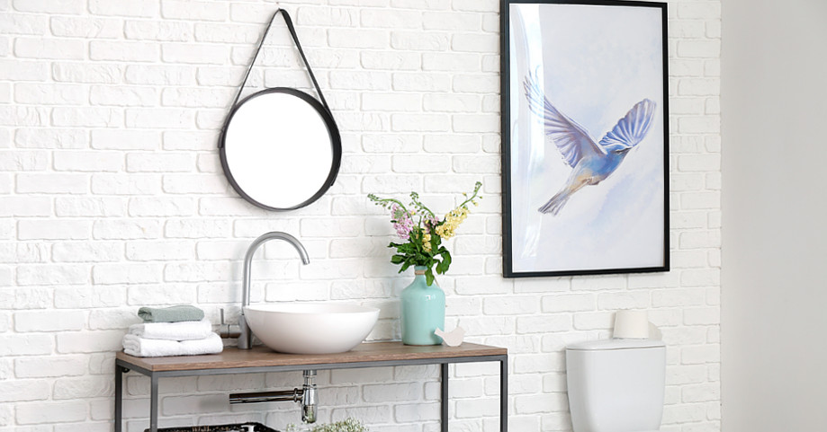 Zamiast płytek jedną ze ścian możesz wykończyć cegłą, tapetą lub fototapetą. Te dedykowane łazienkom są wodoodporne, a piękny wzór czy zdjęcie ożywią Twoją łazienkę. Inna ciekawa opcja to grafika, plakat czy obraz – trzeba tylko pamiętać, że w toalecie jest większa wilgoć, warto więc grafikę trzymać za szkłem.