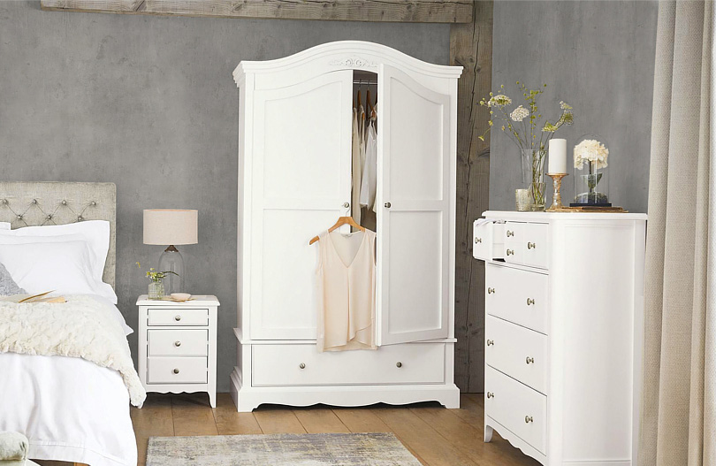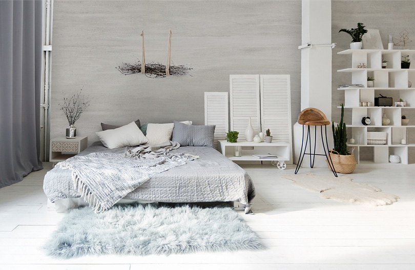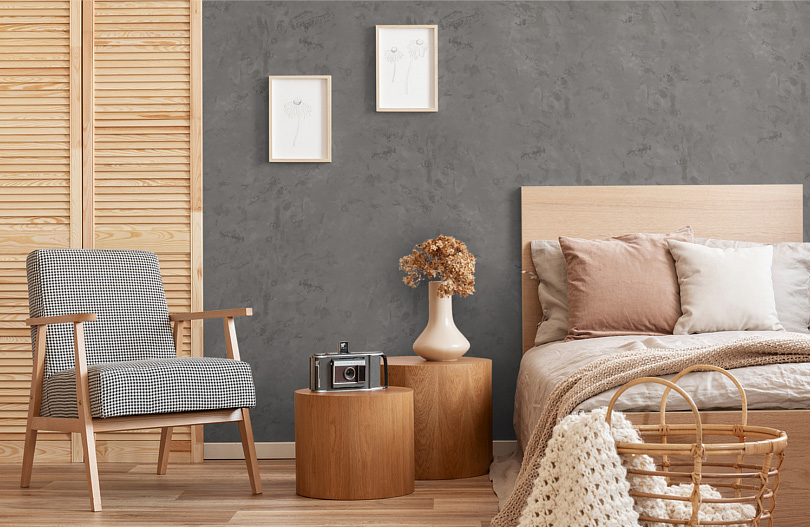 Beton kojarzony najczęściej z przemysłową architekturą przestrzeni miejskiej wszedł do wnętrz domów mieszkalnych i na dobre się tu rozgościł. Wniósł do pomieszczeń ciekawą teksturę wykończenia ścian, podłóg, mebli czy akcesoriów dekoracyjnych, pojawiając się w nieoczekiwanych miejscach. Zobacz inspiracje betonowej ściany w sypialni. Piękno betonu polega na tym, że doskonale łączy się z innymi materiałami, takimi jak drewno, len, wełna, miedź czy mosiądz. Łagodzą one jego surowość i optycznie ogrzewają charakterystyczny chłód. Dzięki temu pomieszczenia z betonowymi ścianami wcale nie muszą być zimne i odpychające, a wręcz przeciwnie – przytulne i zachęcające. Zauważ, ile miękkości i ciepła mogą wnieść do sypialni z betonową ścianą białe drewniane meble z dekoracyjną rzeźbą, lniane zasłony, lniane tapicerowane i pikowane wezgłowie łóżka, drewniana podłoga, miękki dywan oraz szklane i miedziane dodatki. Jasna paleta kolorystyczna, biel dopełniona beżami oraz kremami i stylowa oaza spokoju gotowa.