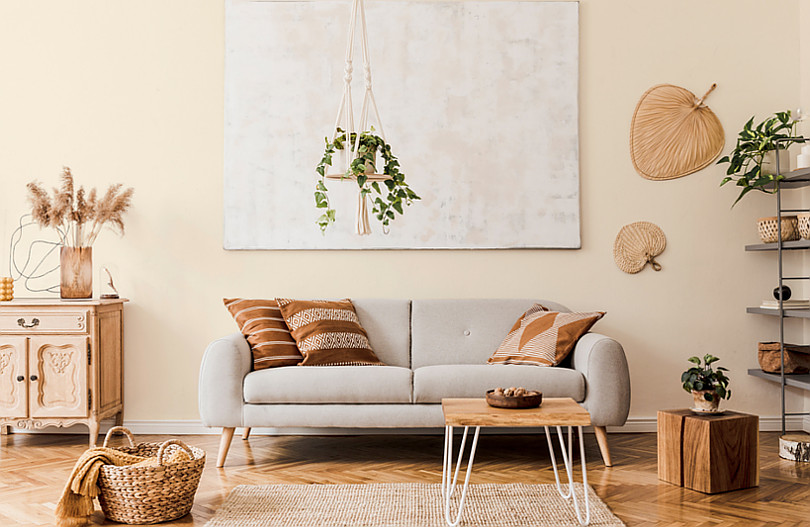 Salon w stylu boho. Ściana za sofą pomalowana farbą MAGNAT #kolorLove w jasnym odcieniu KL10 jasna wanilia.