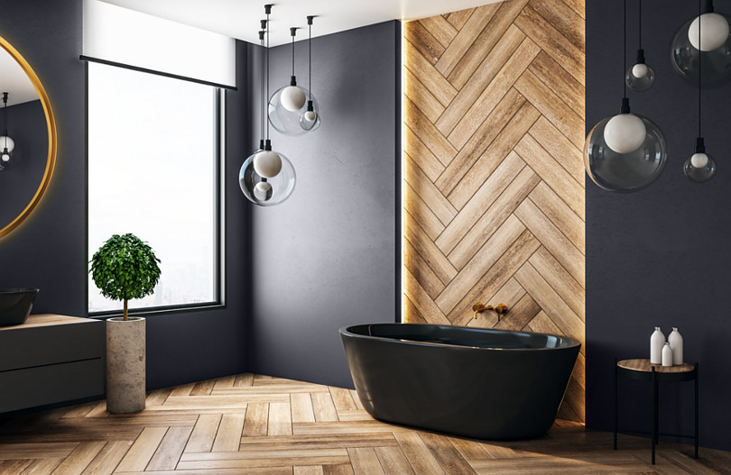 Spójrz, jak pięknie może wyglądać czarna łazienka z drewnem, które rozjaśnia i wizualne ogrzewa wnętrze i czerń farby MAGNAT Ceramic Kitchen&Bathroom B11 Burzliwy Hematyt. Postarzane deski ułożone w jodełkę na podłodze i na części ściany dodały aranżacji dynamizmu, podobnie jak szklane, kuliste żyrandole zróżnicowanej wielkości zawieszone na różnych wysokościach.