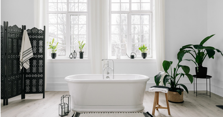 A czerń? Idealnie zagra tu w postaci dodatków – czarny ażurowy parawan, czarne stojaki na kwiaty i doniczki. Zauważ również, że wystarczyły drobne detale w ciepłym odcieniu drewna i rattanu oraz soczysta zieleń i od razu łazienka nabrała życia.