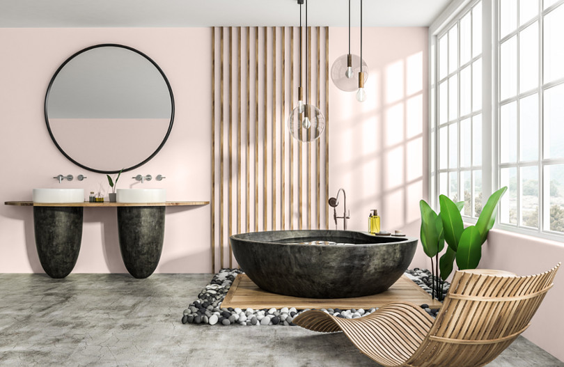 Wybierając styl minimalistyczny, ta gra kolorów stanie się najistotniejsza w przestrzeni. Jedną jej część pokryj czarnymi materiałami – ściany czarnymi kafelkami, a podłogę betonem dekoracyjnym. W drugiej części podłogę pokryj imitacją jasnego kamienia, a ściany pomaluj farbą MAGNAT Ceramic Kitchen&Bathroom B5 Czysta Biel. W ten sposób możesz np. oddzielić od siebie dwie strefy – tę z prysznicem od tej z wanną. W każdej z nich zadbaj o akcesoria w pasującym kolorze. Możesz wprowadzić również szare dodatki, by złagodzić kontrast.