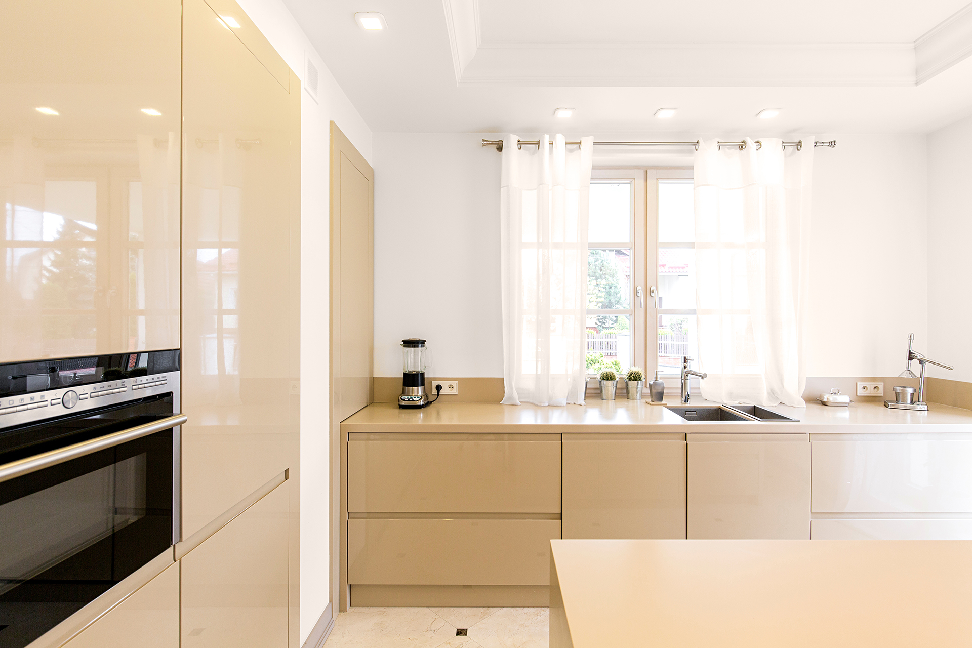 Kolor kaszmirowy wprowadzisz także do kuchni. Umożliwi to farba w odcieniu bardzo jasnego beżu lub farba ecru do ścian. Polecamy odcień B4 Górski Opal MAGNAT Ceramic Kuchnia, Łazienka. W tej aranżacji kuchni stworzył ciepłą atmosferę i powiększył wnętrze optycznie. Także fronty kuchennej zabudowy mają ciepły kaszmirowy odcień.