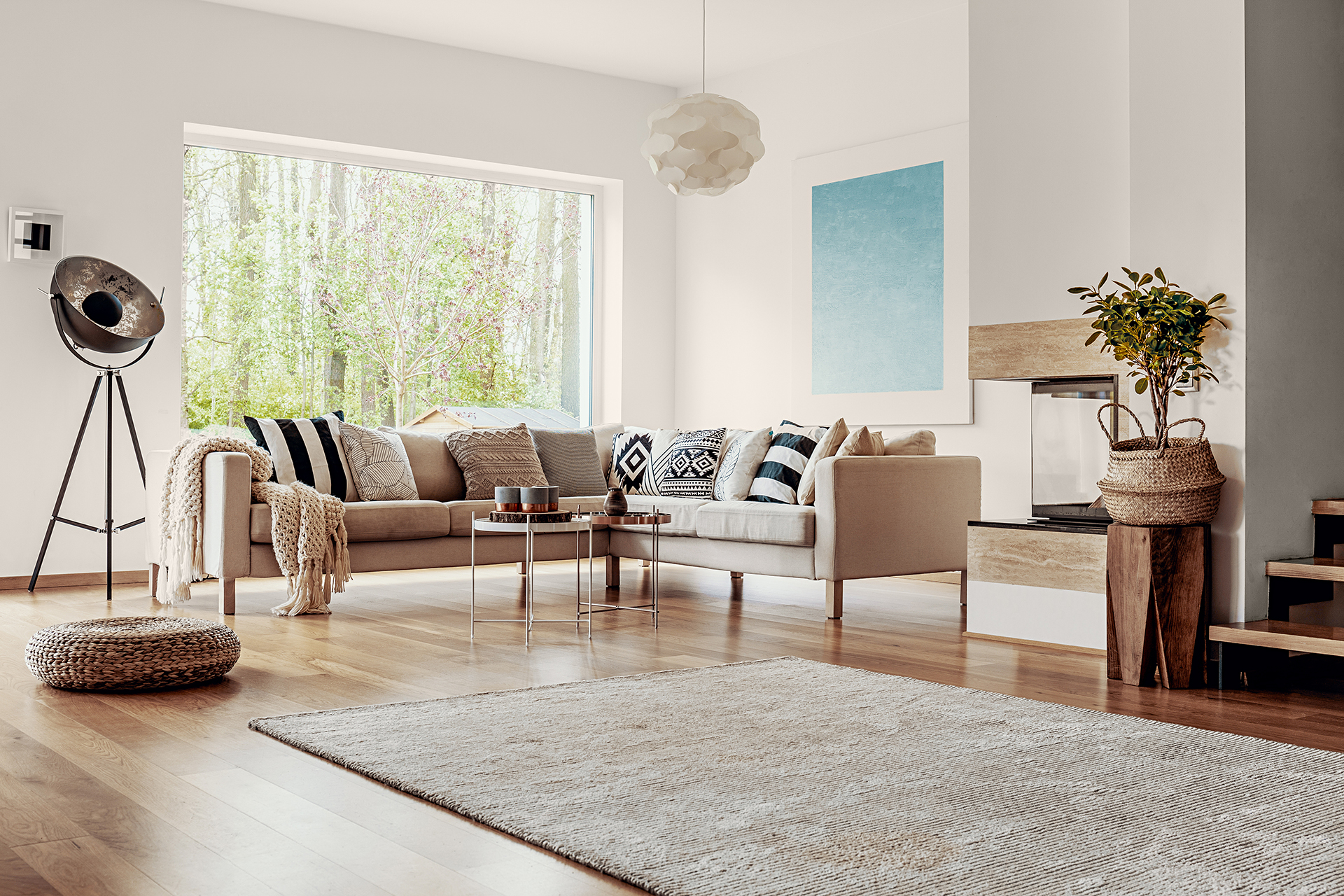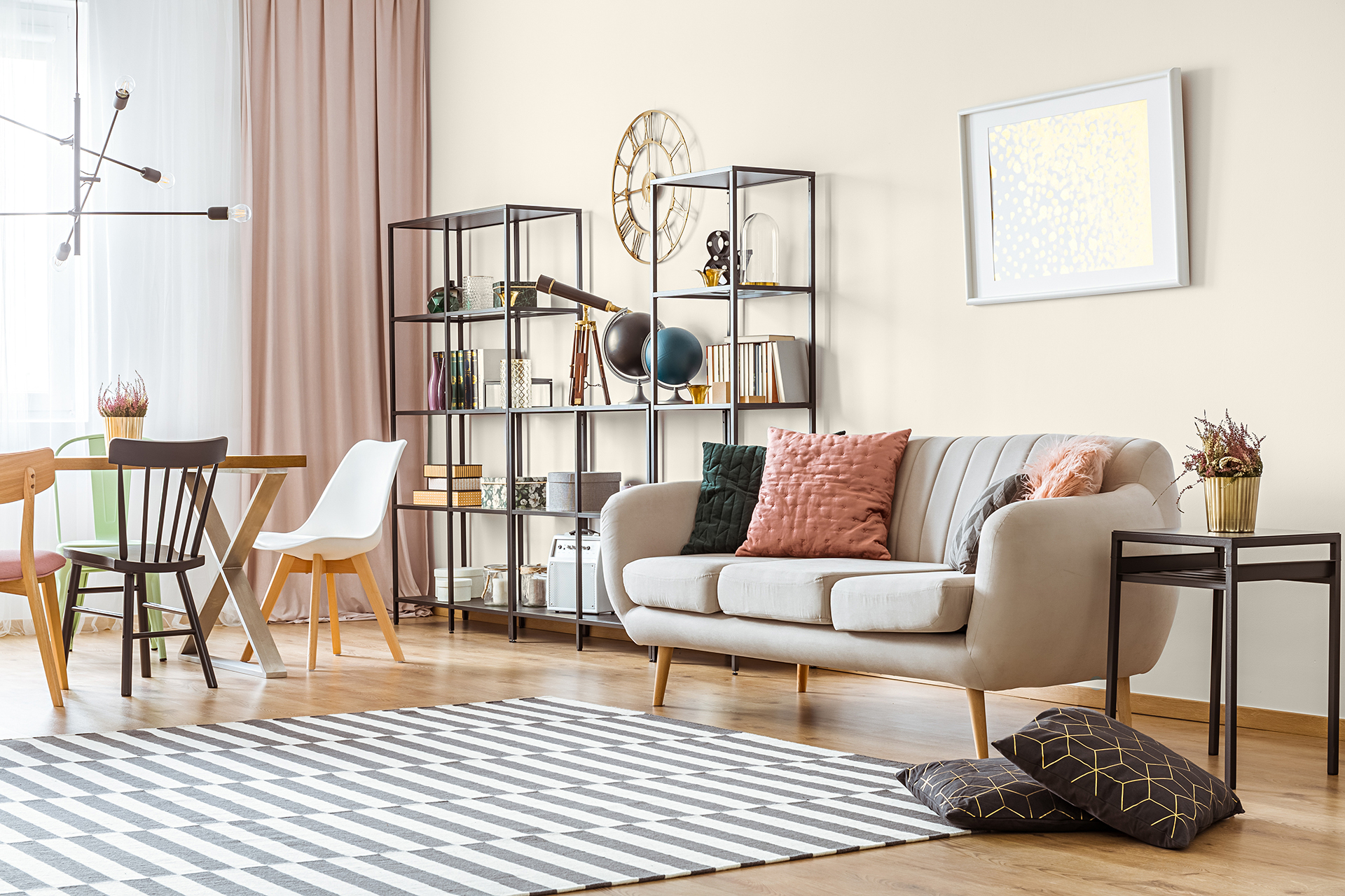 Wybrany kolor farby to C48 Perłowy Dolomit MAGNAt Ceramic. Jasna ściana to znakomite tło dla beżowej skandynawskiej sofy na drewnianych nóżkach. Równie dobrze odnajdują się tu także czarne ażurowe meble loftowe oraz pastelowe krzesła w klimacie vintage. Całość ociepla dywan z geometrycznym wzorem.