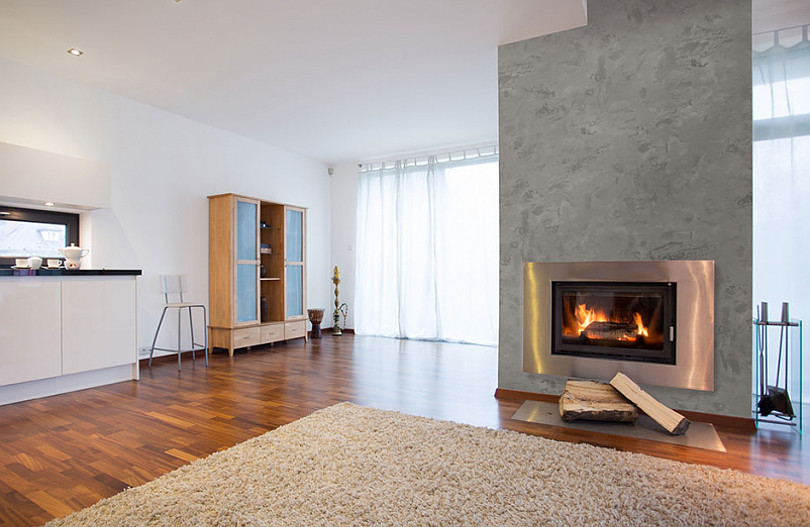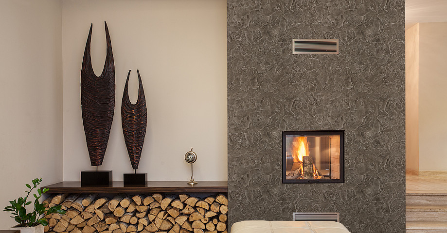 Podkreślić go można dodatkowo obudową kominka. Poprzez zastosowanie na niej tynku dekoracyjnego bądź farby strukturalnej – produktów malarskich, które w łatwy sposób sprawią, że kominek będzie wyglądał jakby był obłożony trawertynem, marmurem czy też betonem.
