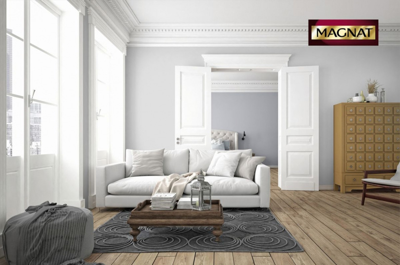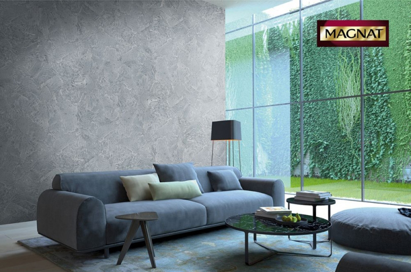 Perłowy połysk jest klamrą, która spina wszystkie sprzęty i nadaje im nowego charakteru. Łatwo się o tym przekonać. Wyobraź sobie, że w prezentowanej aranżacji ściany są po prostu szare. Zginęłyby przytłoczone dużymi oknami, a sama realizacja projektu wydałaby się po prostu ładna i poprawna. Wystarczyło jednak, że użyliśmy dekoracyjnej farby strukturalnej MAGNAT Style Stiuk Perłowy Hematyt i wnętrze zyskało na szlachetności, wygląda na bardziej luksusowe, niż by to miało miejsce w przypadku ścian pozbawionych blasku. Efekt perłowego połysku jest doskonałą opcją dla tych, którzy bez wydawania ogromnej sumy pieniędzy chcą stworzyć wnętrze sprawiające wrażenie przepychu oraz dla tych, którzy po prostu chcą dodać pomieszczeniom subtelnej nuty glamour. Opalizujące struktury MAGNAT spełnią oczekiwania i jednych i drugich.