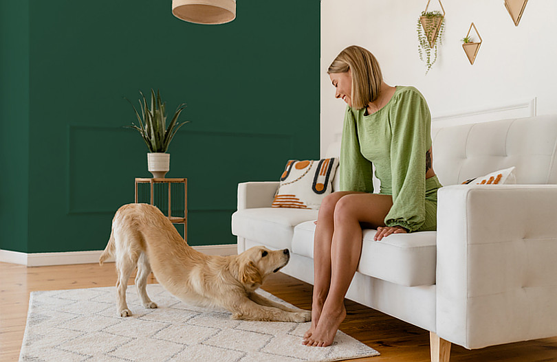 Salon w stylu boho. Ściana za sofą pomalowana farbą MAGNAT Ceramic w kolorze C80 ciemnozielony malachit.