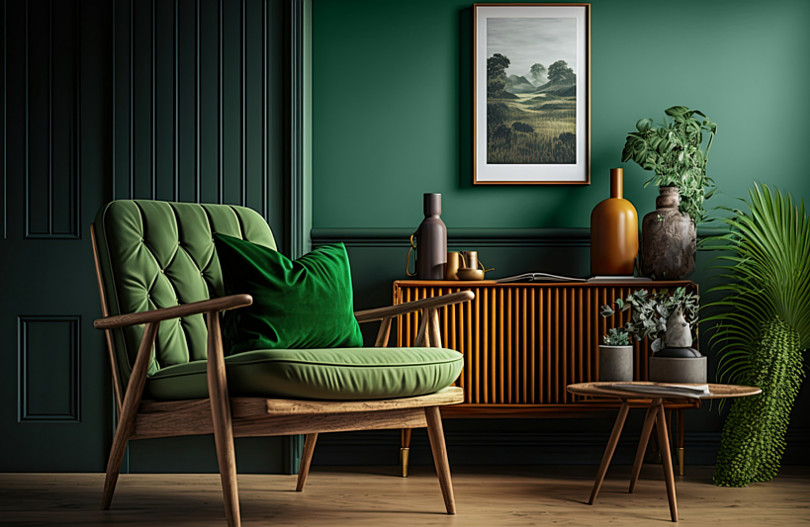 Ciemna zieleń to także kolor, który kojarzy się ze stylistyką vintage i mid-century modern, czyli lat 50. i 60. Ściana pomalowana kolorem C80 ciemnozielony malachit będzie doskonałym tłem dla klasyków designu z tamtych lat – foteli z PRL projektu Chierowskiego, fornirowanych biblioteczek czy krzeseł patyczaków.