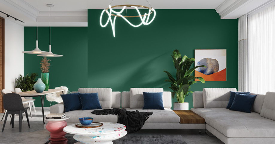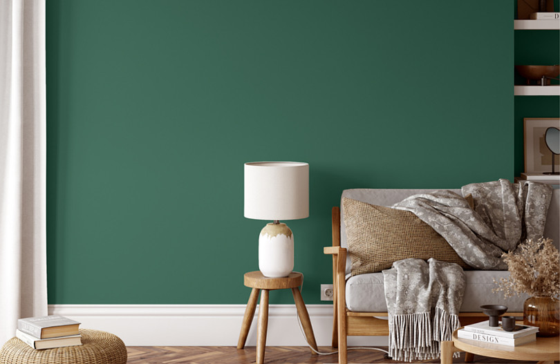 Wnętrze w stylu eko ze ścianą pomalowaną farbą C80 ciemnozielony malachit MAGNAT Ceramic.