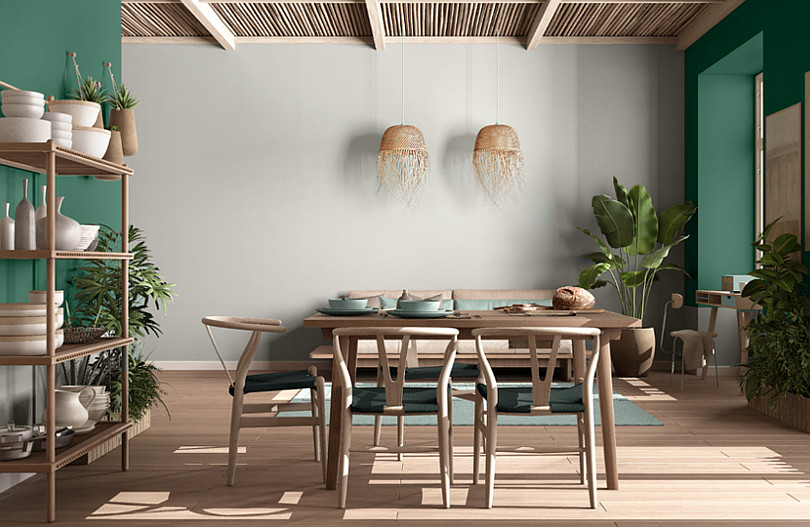 Ciemna zieleń będzie idealną bazą do drewnianych mebli i dodatków z plecionych sznurków, wikliny, rattanu i innych typowych dla boho materiałów.