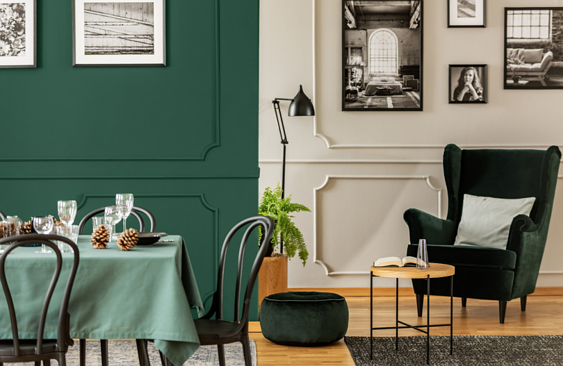 Jadalnia w stylu modern classic. Na zdjęciu ściana wykończona sztukaterią i pomalowana kolorem C80 ciemnozielony malachit MAGNAT Ceramic oraz C1 biały diament.