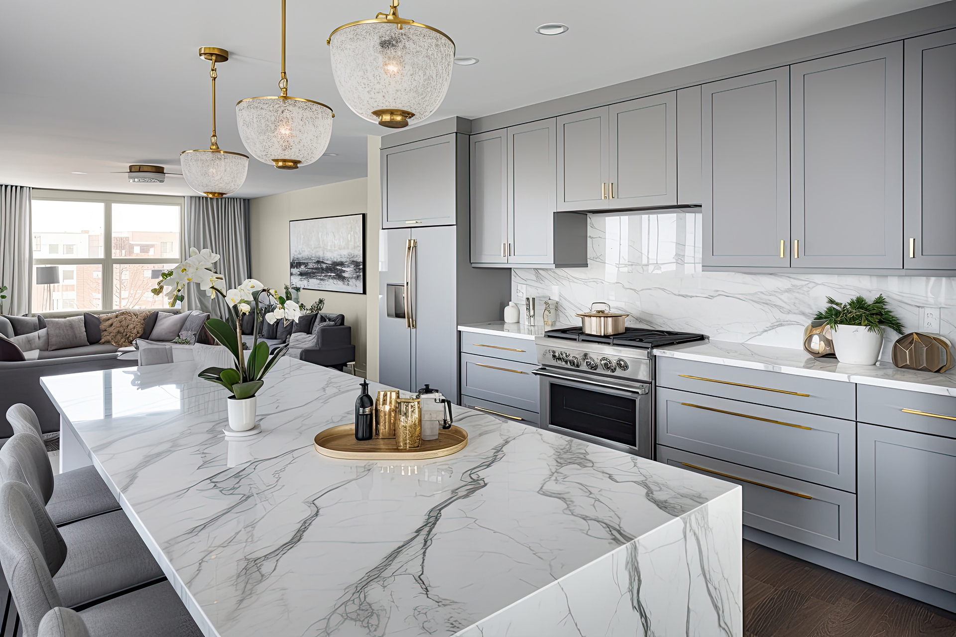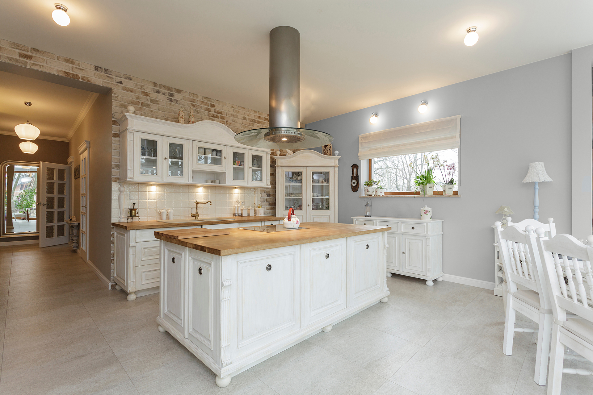 Włoskie kuchnie są przestronne i dobrze wyposażone, ponieważ Włosi, jak wiadomo, lubią dobrą kuchnię. W aranżacji na zdjęciu do klasycznych szarych mebli kuchennych dobrano płytki ze wzorem marmuru, a pozostałe ściany pomalowano na biało farbą MAGNAT Ceramic Kuchnia, Łazienka B6 Śnieżny Agat.